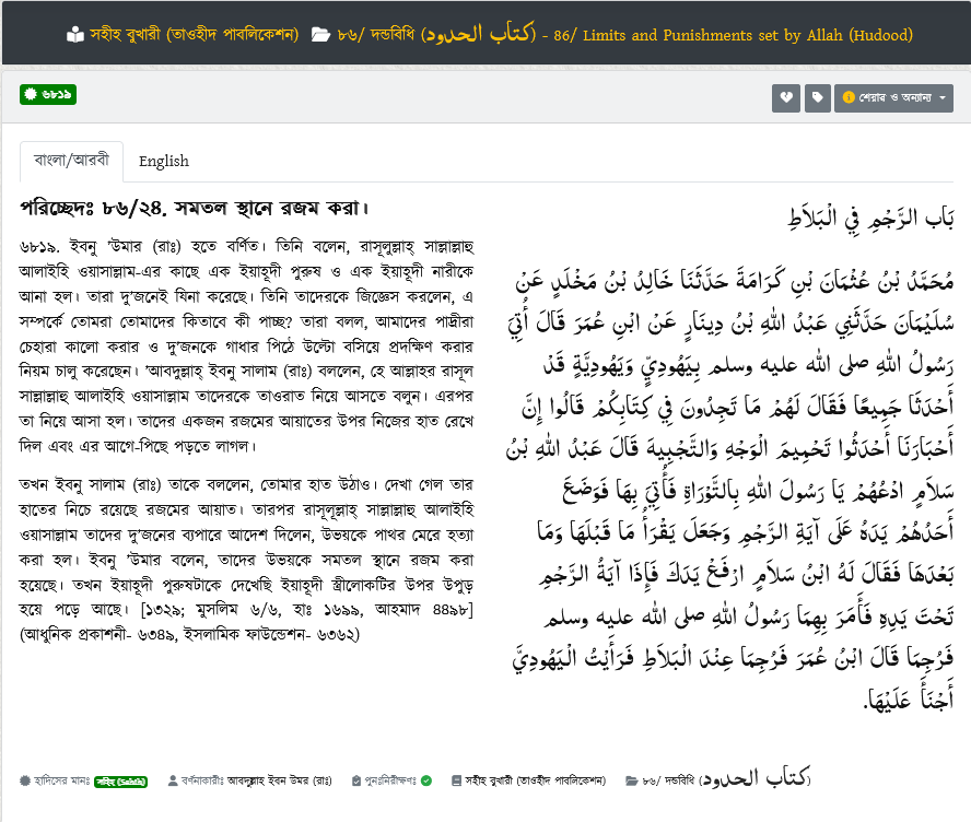 বিঃ দ্রঃ উপরোক্ত হাদিসটি “রাজম” (পাথর দিয়ে মৃত্যুদণ্ড — স্তোনিং) নিয়ে ব্যাপক আলোচনা আছে কিতাবে ও শাস্তি-চর্চায়; কিন্তু সরাসরি কুরআনের কোনো আয়াতে পাথর মারা (স্তোনিং) বিধান হিসাবে স্পষ্টভাবে লেখা নেই — রাজমের বিধান প্রধানত সাহাবী/হাদিস ও ক্লাসিকাল ফিকহি রায় থেকে এসেছে। কুরআনের সূরা নূরের ২ নং আয়াতের সাথে যা সাংঘর্ষিক।
